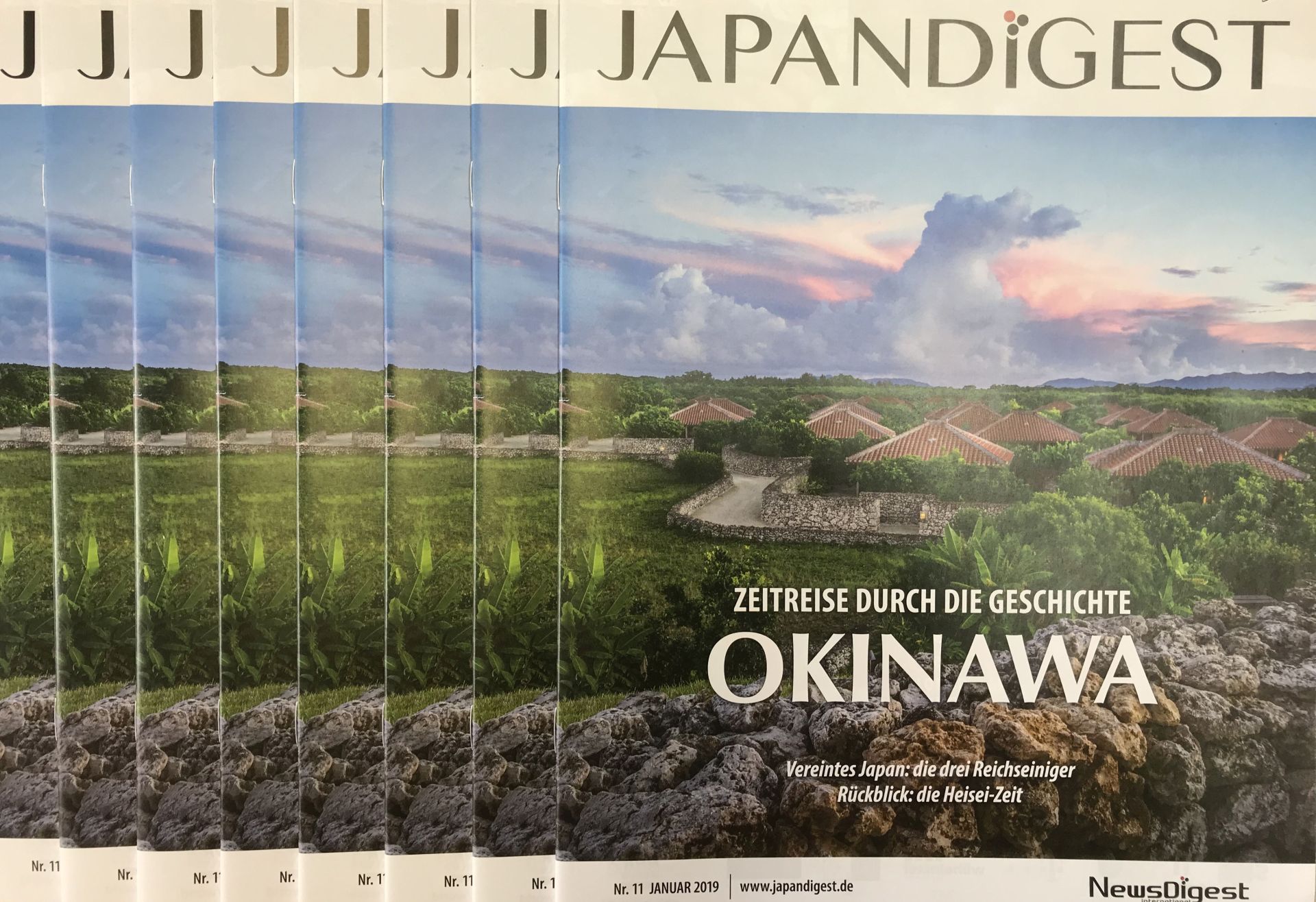 Seit 2018 erscheinen vier Ausgaben der kostenlosen Zeitschrift JAPANDIGEST pro Jahr und bieten auf rund 30 Seiten Japan-Information. Das erste Heft für 2019 ist jetzt da! Unter anderem bietet es den Artikel "Meine Okinawa-Reise - Die Vergangenheit Ryūkyūs entdecken", einen Überblick über die Heisei-Zeit und einen Artikel zu Sengoku-Jidai, den Artikel "Kimono im Wandel" und einen Einblick in die Eigenheiten der japanischen Sprache.