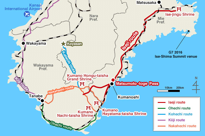 Unter den Pilgerrouten des Kumano Kodo gibt es die Iseji-Route, die vom Ise-Schrein in Mie Präfektur beginnt, die Kohechi Route vom Koyasan, und die Nakahechi-Route die in Tanabe in der Wakayama-Präfektur beginnt. Die Kumano Kodo Iseji-Route wird von vielen Pilgern bevorzugt.