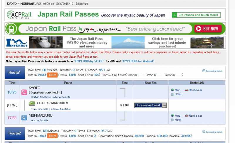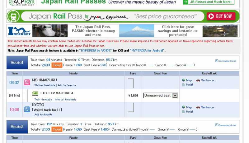Wenn Sie vor Ihrer Reise nach Maizuru irgendwo in Japan landen werden, konnen Sie dort (vielleicht in Fukuoka) die Fahrkarten kaufen. Wenn Sie JR Railpass nicht benutzen werden, werden Sie Fahrkarten und Platzkarten (inkl. Express-Zuschlag) am JR-Bahnhof (am Grunen Schalter, auf jap. “Midori-no-mado-guchi”) vorher besorgen, aber nur ein Monat vor dem Reisetermin. Maizuru Express besteht aus nur 2 oder 3 Wagen, und es ist besser, jedenfalls vorher sie zu besorgen.