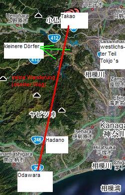 2. Könnte man von Mount Takao (westlich Tokjo) südsüdwestlich nach Odawara zu Fuß wandern? Auf Google Maps sieht es so aus, also wären (quasi parallel zur äußeren Grenze Tokjos) dort keine anderen Städte und man könnte schön in der Natur (bis auf scheinbar zwei kleine Dörfchen an den Flüssen direkt in der Nähe des Berges) diese (ich schätze) 40-50 Kilometer luftlinie zu Fuß zurücklegen (zumindest bis nach Hadano). Ich hänge es an, damit ihr ein klares Bild davon habt.
