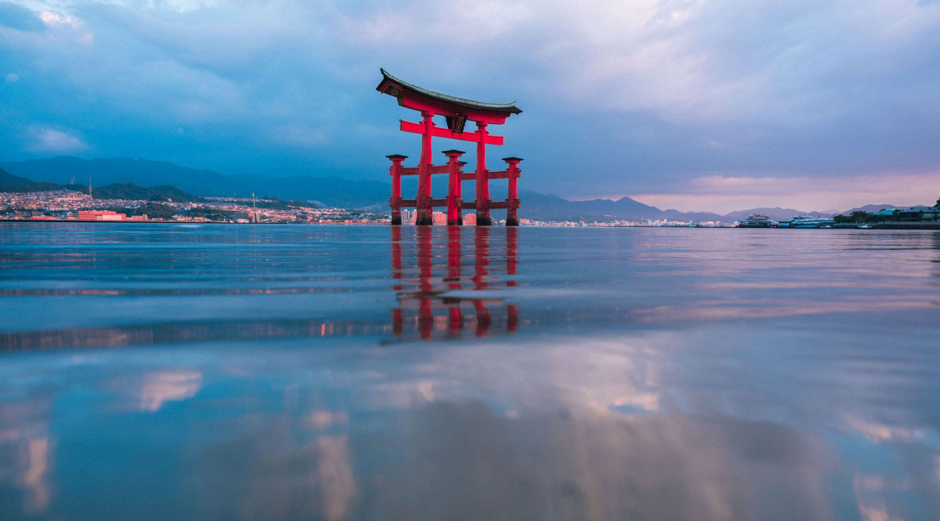 Der Schrein mit dem roten Tor im Wasser ist eine der meistfotografierten Sehenswürdigkeiten in Japan: Seit dem 12. Jh. stehen die Schrein-Gebäude auf Stelzen in die seichte Bucht gebaut, so dass der elegante Bau bei Flut gleichsam über dem Wasser zu schweben scheint, und das zinnoberrote Tor am Eingang zur Bucht sich im Wasser spiegelt. Der Weg durch das Tor ist der traditionelle Zufahrtsweg zu der heiligen Stätte.