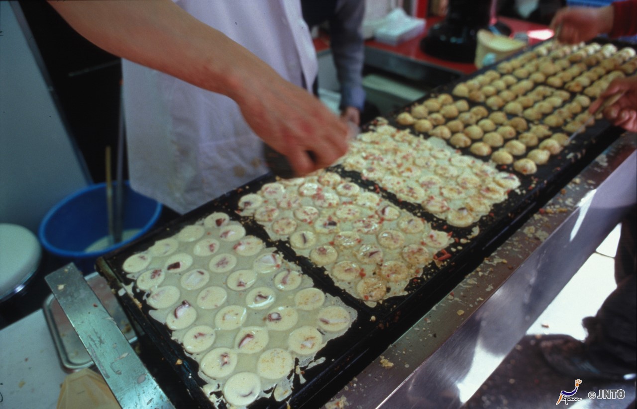 Oktopus-Bällchen werden zubereitet, indem man Teig mit Brühe vermengt und auf einem speziellen Brateisen mit Löchern verteilt, Oktopusstücke mit kleingehackten Zwiebeln, Kohl und eingelegtem Ingwer dazugibt und den Teig beim Braten so wendet, dass Kugeln entstehen. Der Teig ist außen knusprig und würzig und innen weich, was den Bällchen eine einzigartige, knusprige Konsistenz verleiht. Als Toppings nimmt man üblicherweise Meersalat, Sauce oder geschnittenen und getrockneten Bonito-Fisch, aber auch Mayonnaise wird immer beliebter. Die Oktopus-Bällchen aus Kansai sind nicht nur köstlich, sondern auch klein und einfach zu essen, was sie zu einem beliebten Gericht in ganz Japan macht.