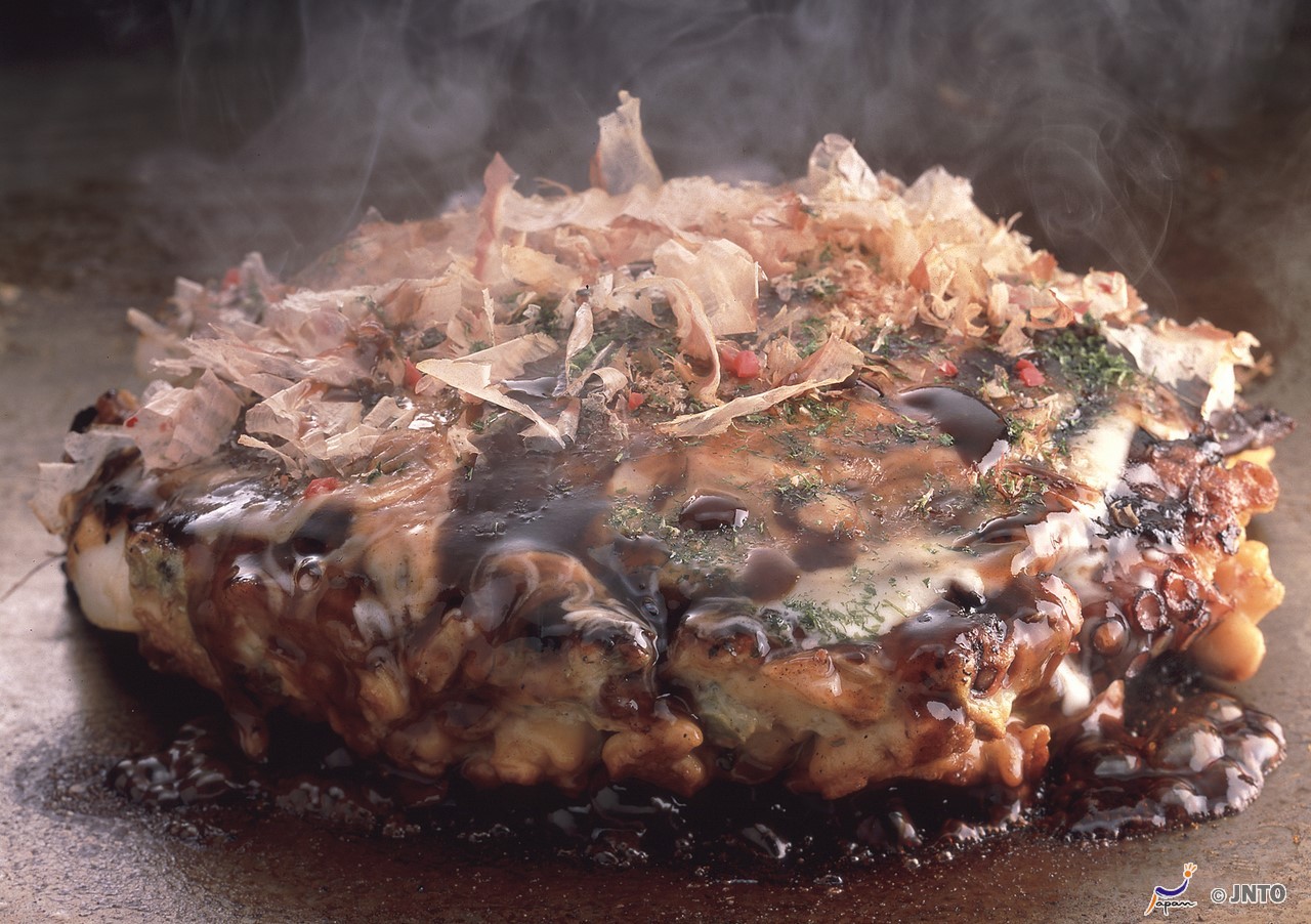In Hiroshima sind Okonomiyaki (herzhafte Pfannkuchen) seit der Vorkriegszeit ein beliebter Snack. Nach dem Krieg fing man an, sie als Gericht zu essen. Aufgrund der Nahrungsmittelknappheit fügte man den Pfannkuchen zusätzlich Zutaten wie Kohl, Ei, Meeresfrüchte und Nudeln zu – und so entstand die bis heute übliche Zubereitungsart. Charakteristisch für diese einzigartigen Pfannkuchen nach Hiroshima-Art sind die sechs Schichten: Pfannkuchenteig, Kohl, dann die Hauptzutaten plus Nudeln und wieder Pfannkuchenteig, dann wird alles gewendet und zusammengedrückt, darauf kommt Spiegelei. Das ergibt eine deftige und ausgewogene Mahlzeit. Ein lokales Unternehmen produziert dazu eine Spezialsauce in vielen Variationen, sodass Sie die Pfannkuchen individuell abschmecken können.