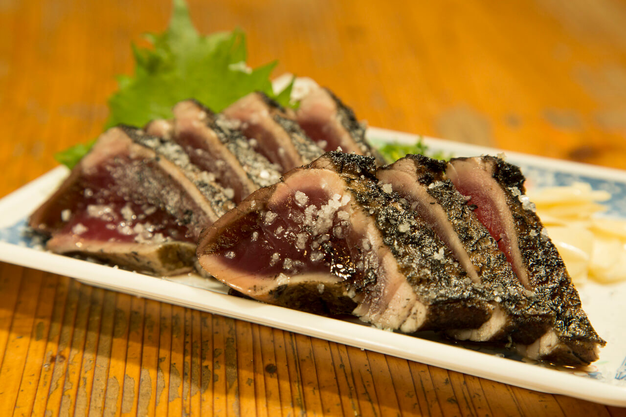 Der Bonito ist in Japan ein sehr beliebter Fisch, und der Nobori-katsuo (nordwärts schwimmender Bonito) ist besonders teuer. Die Tosa-Region von Kochi ist berühmt für ihre hohe Bonito-Qualität. Der Fisch wurde tatsächlich zum offiziellen Fisch der Präfektur auserkoren. Er ist köstlich, wenn man ihn als Sashimi isst, und er ist der Hauptbestandteil von Sawachi, einem traditionellen Gericht der Tosa-Region. Ein anderes berühmtes Gericht ist Tataki (leicht gegrillter Bonito). Ein Bonito-Filet wird leicht gegrillt, sodass es eine goldene Färbung bekommt, aber im Inneren sollte es noch roh sein. Gleich nach dem Grillen wird es in kaltes Wasser gelegt und schnell abgetrocknet. Anschließend isst man es mit Lauch, Ingwer, Shiso (japanisches Basilikum) oder Knoblauch und tunkt es in Ponzu-Sauce (Zitronen-Essig-Sauce).