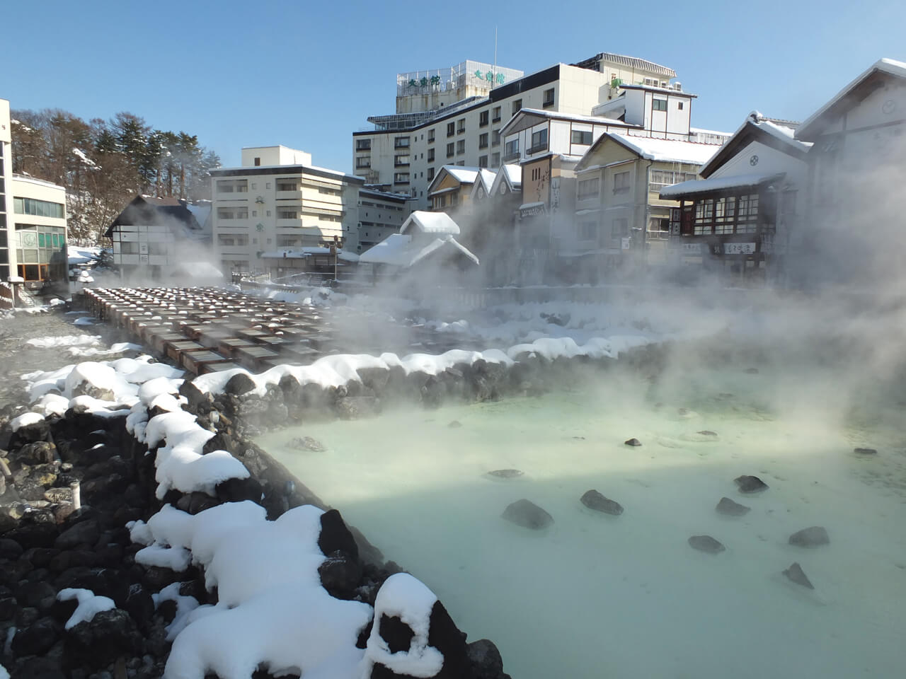 In der bergigen Region der Präfektur Gunma liegt ein Thermalort neben dem anderen. Wohin man sich auch wendet sprudeln heiße Quellen. So auch im Ort Kusatsu, dessen zentrale Quelle Yubatake schon seit dem 12. Jh. bekannt ist. Kusatsu-Onsen liegt am Fuß des Berges Shirane.