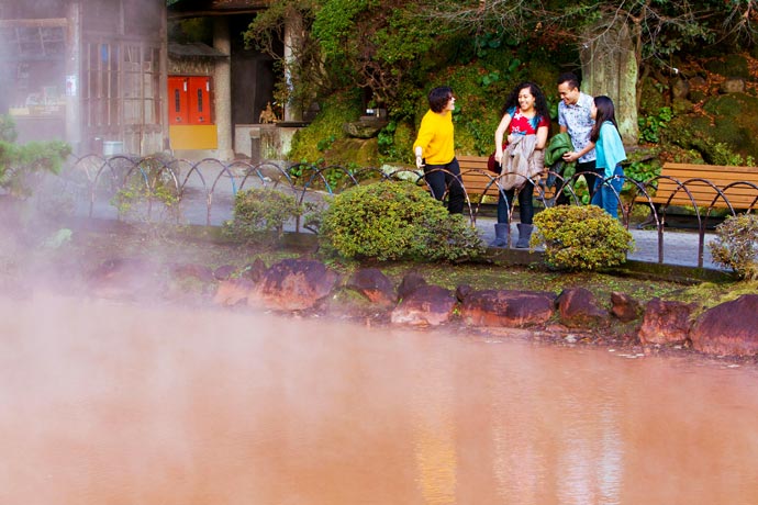 “Auf keinen Fall!“, war ihre Antwort. „Das Wasser hier ist 98 °C heiß! Wir schauen es uns nur an!" Es gibt einen speziellen Sightseeing-Ablauf, der zu all jenen Onsen in der Beppu-Region führt, die sprichwörtlich „heiß sind wie die Hölle“ (jigoku). Wir lachten und machten einige Erinnerungsfotos mit Saaya und ihrer Freunding vor dem roten Wasser.
