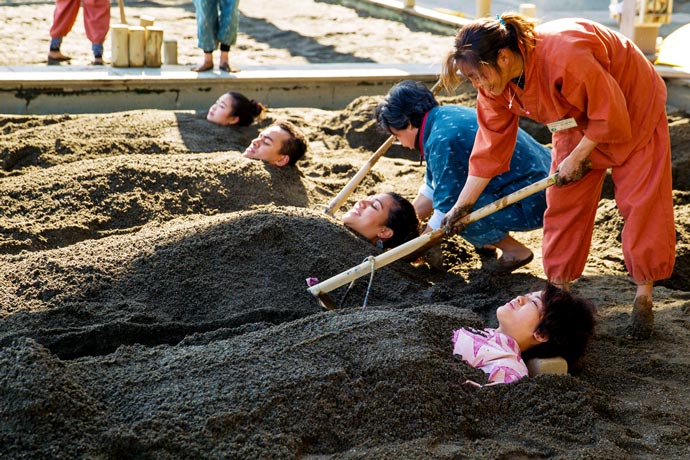 Danach probierten wir auch das Sandbad im Beppu Kaihin Sunayu. Als mir erklärt wurde, dass ich in einen Yukata gekleidet im Sand eingegraben würde, fragte ich mich schon, was dass für eine seltsame heiße Quelle sein sollte. Der Sand wird hier von einer unterirschen heißen Quelle erwärmt und der heiße Sand ließ mich ordentlich schwitzen. Saaya erklärte mir alle Vorzüge des Sandbades für Schönheit und Haut.