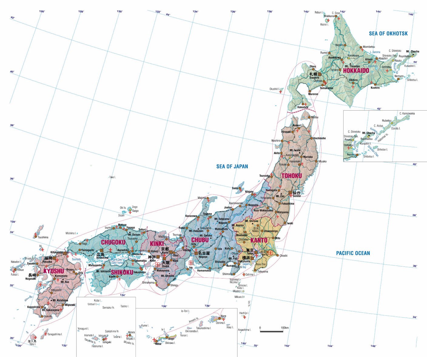 Japan ist ein Inselstaat, der sich im nördlichen Pazifischen Ozean am östlichen Rand des asiatischen Kontinents befindet. Japans Gesamtoberfläche von 377.708km2 untergliedert sich in vier Hauptinseln (Hokkaido, Honshu, Shikoku und Kyushu), die von etwa 4.000 kleineren Inseln umgeben sind. Somit ist Japan nur wenig kleiner als Deutschland und die Schweiz zusammengenommen.